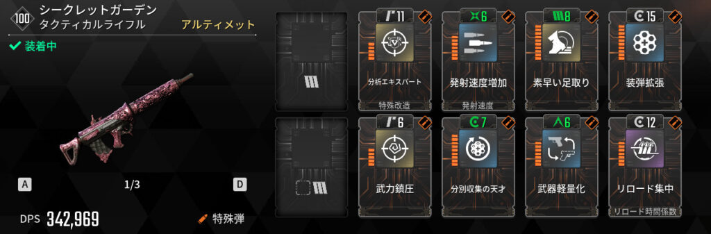 この銃で火力を出すわけではないのでモジュールはほとんどいりませんが、画像にあるモジュールは役に立つと思います。分析エキスパートはスキルには影響しませんが、銃器クリティカル耐性を下げることができるのでマルチで銃器キャラ(グライ・セレナなど)が他にいるならこれも有用です。